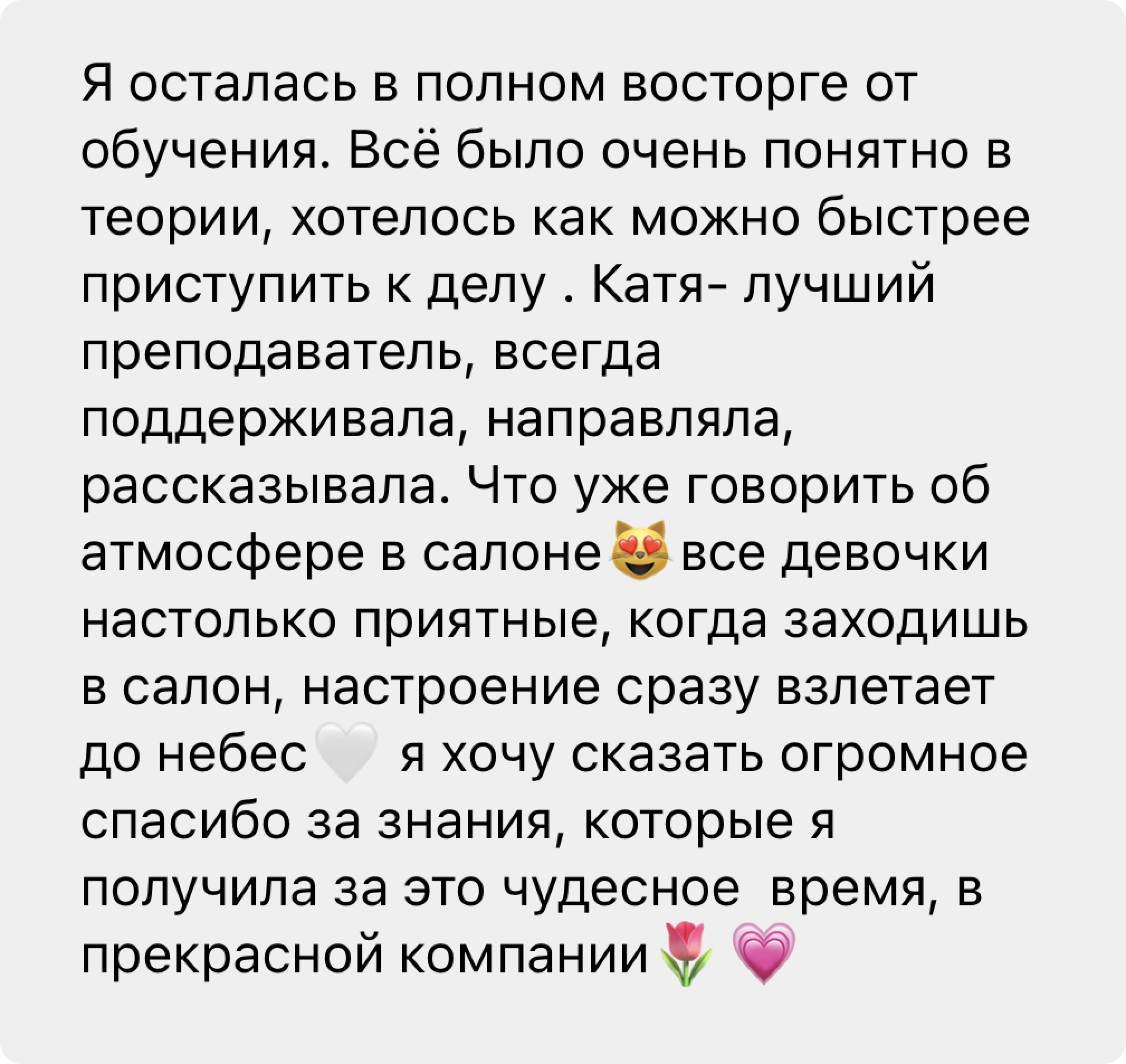 около 500 положительных отзывов, ежедневная 80-100% загруженность, высокий уровень компетенций, клиенты идут по сарафанному радио, о котором мечтают многие мастера.